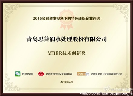 近日,在 “2015金融資本視角下的特色環(huán)保企業(yè)年度評選"活動中,思普潤榮獲 “MBBR技術(shù)創(chuàng)新獎”!思普潤自創(chuàng)立以來,成功將MBBR工藝應(yīng)用于大型市政污水處理廠新建及升級改造,擁有國內(nèi)較多MBBR工藝的工程業(yè)績。公司現(xiàn)已擁有具備污水處理行業(yè)核心競爭力的MBBR自主知識產(chǎn)權(quán)及產(chǎn)品、MBBR相關(guān)技術(shù)研發(fā)創(chuàng)新能力和廣泛的MBBR工藝運行業(yè)績。