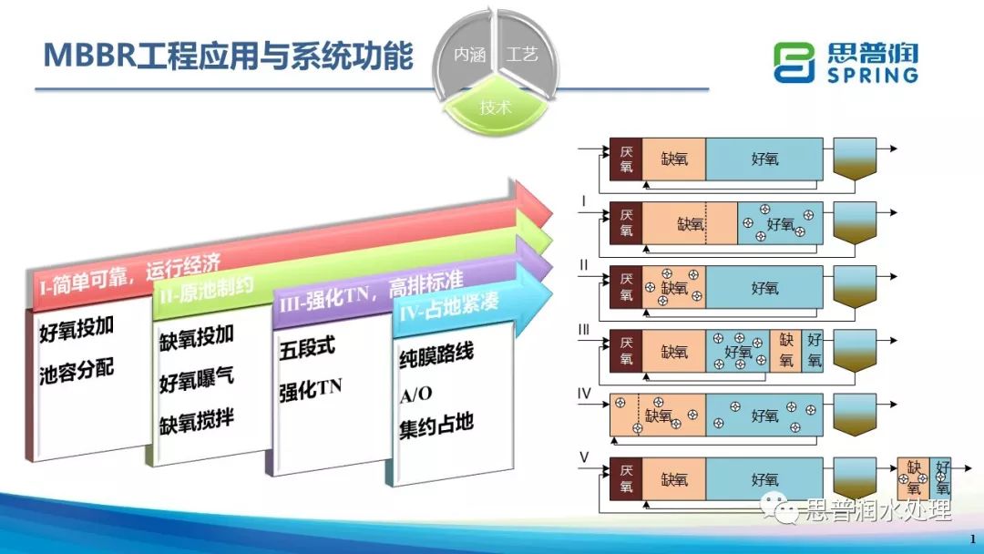MBBR不僅僅是增大生物量,是具有豐富微觀原理及宏觀機(jī)理內(nèi)涵的新工藝、新技術(shù)。微觀上,懸浮載體為微生物的進(jìn)化提供了時(shí)間和空間,水力剪切對(duì)于生物掛膜具有重要作用,懸浮載體引入增加了微生物菌落的多樣性;宏觀上,MBBR突破了非好氧池容與好氧池容比例的限制,原池五段Bardenpho改造突破了TN回流比的限制,雙泥齡系統(tǒng)突破了傳統(tǒng)活性污泥法氮磷泥齡矛盾的限制。
