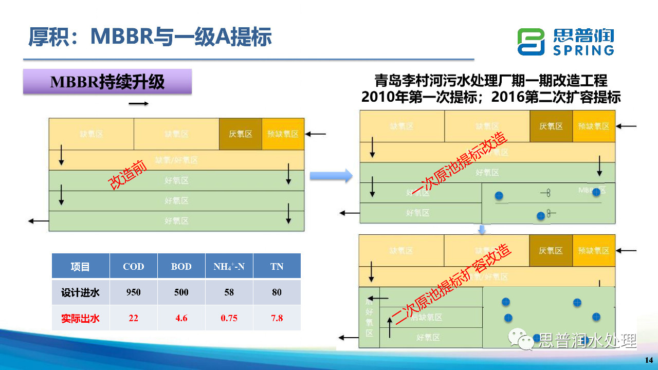 MBBR工藝因其特有的工藝分區(qū)及懸浮載體填料的可調(diào)整特點,可以實現(xiàn)污水廠的持續(xù)升級。青島李村河污水處理廠應(yīng)用MBBR工藝:分別于2010年與2016年進(jìn)行了生化池原池提標(biāo)和提標(biāo)+20%擴容兩次升級。