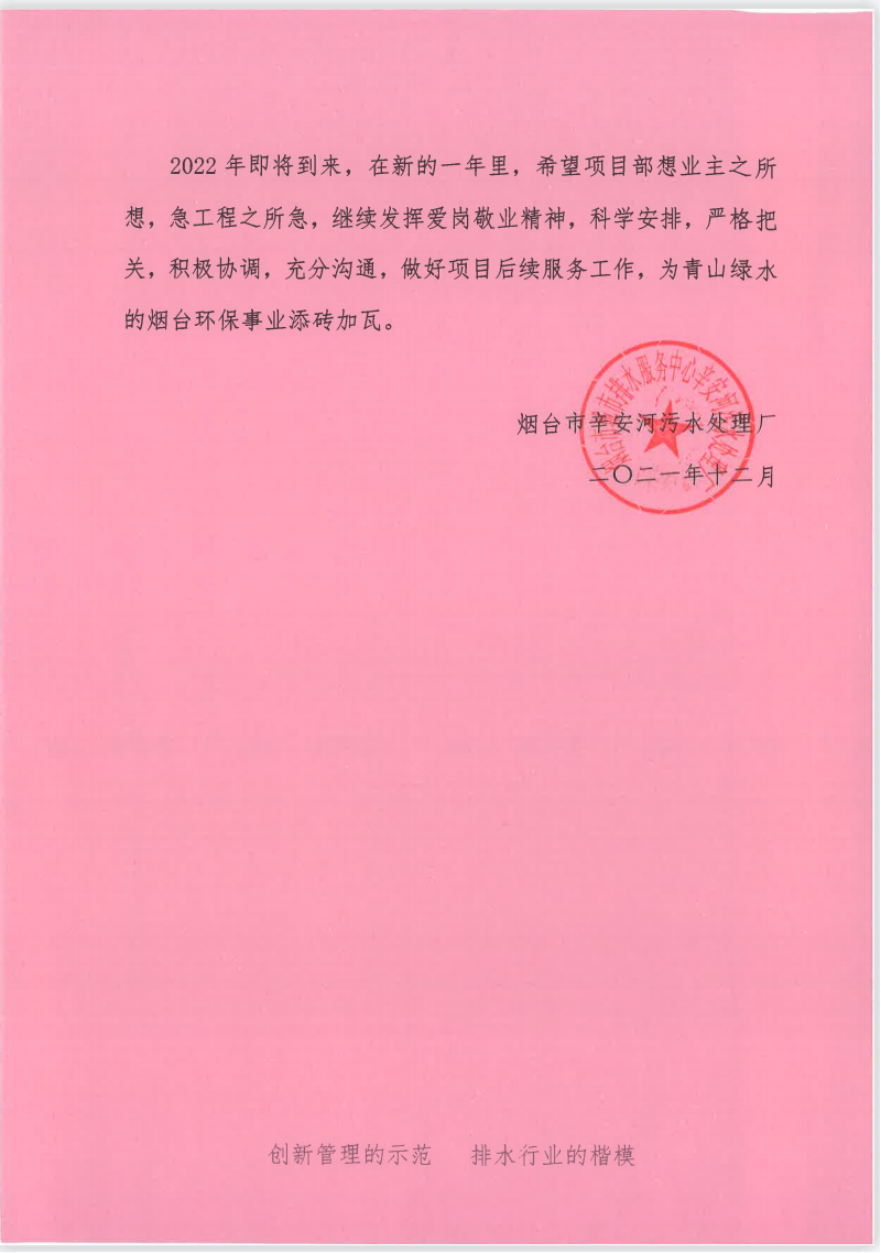 正值2022年來臨之際,我司收到了山東省煙臺(tái)市辛安河污水處理廠發(fā)來的表揚(yáng)信,這是客戶對(duì)我們?cè)谛涟埠游鬯幚韽S1萬m3/d的BFM工藝技術(shù)改造項(xiàng)目的充分肯定!