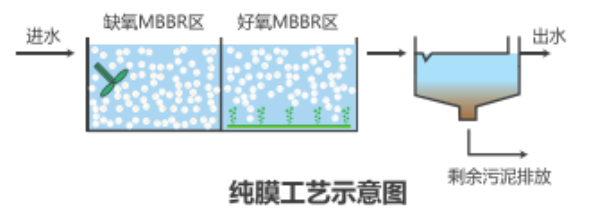 純膜MBBR工藝是MBBR工藝的一種應(yīng)用形式,生化池中的微生物主要以生物膜形式附著于懸浮載體上,依靠生物膜對污染物進(jìn)行降解。