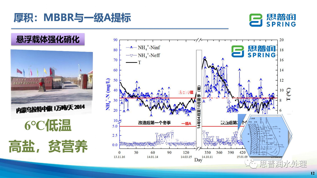 MBBR在國內(nèi)尤其是北方地區(qū)的廣泛應(yīng)用,一個重要原因是能夠應(yīng)對冬季低水溫導(dǎo)致的氨氮出水不達(dá)標(biāo)問題。2014年,內(nèi)蒙古烏拉特中旗污水處理廠采用我司MBBR技術(shù)進(jìn)行提標(biāo)改造,在冬季3~4個月水溫在6℃的情況下,改造后冬季出水氨氮穩(wěn)定達(dá)到一級A標(biāo)準(zhǔn)。
