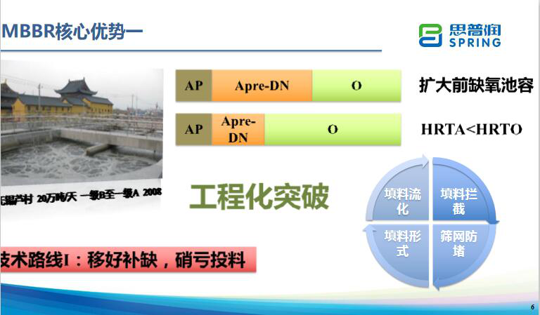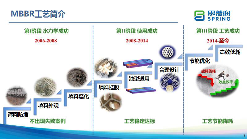 思普潤(rùn)成立于2006年,至2008年我司通過(guò)大量試驗(yàn)保證水力學(xué)的成功; 2008年至2014年,在前一階段成功的基礎(chǔ)上,我們開(kāi)始了大規(guī)模的工程應(yīng)用,根據(jù)不同的池型、水質(zhì)等因素進(jìn)行自主設(shè)計(jì)施工,保證工藝穩(wěn)定達(dá)標(biāo)。從2014年到現(xiàn)在,我司做到在保證工藝穩(wěn)定達(dá)標(biāo)的基礎(chǔ)上進(jìn)行節(jié)能降耗。從整個(gè)時(shí)間發(fā)展上看,思普潤(rùn)是與MBBR在國(guó)內(nèi)的發(fā)展是同步的,總結(jié)起來(lái)我司的MBBR工藝包核心共有五大優(yōu)勢(shì)。