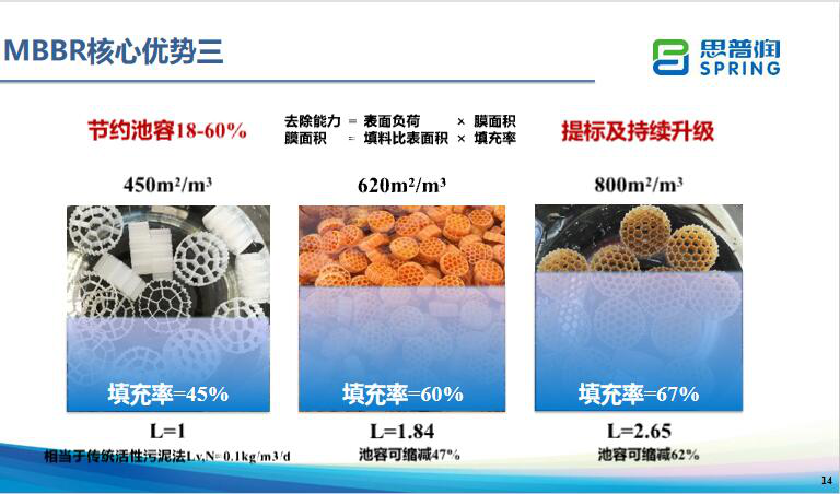 MBBR工藝可通過(guò)提高填充率或改換比表面積更大的懸浮載體填料來(lái)實(shí)現(xiàn)污水廠(chǎng)的持續(xù)升級(jí)提標(biāo),充分體現(xiàn)了MBBR工藝在新建或改造項(xiàng)目中極大的延展性。