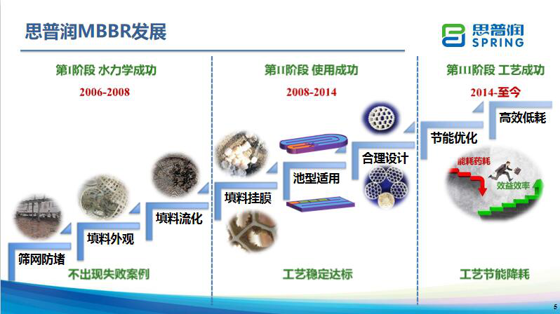 青島思普潤(rùn)成立于2006年,從2006年到2008年是公司發(fā)展MBBR的第一個(gè)階段,主要是不出現(xiàn)失敗案例,保證水力學(xué)的成功;從2008年到2014年,在第一階段成功的基礎(chǔ)上,我們開始了大規(guī)模的應(yīng)用,設(shè)計(jì)了不同的池型、不同的水質(zhì)等,保證工藝穩(wěn)定達(dá)標(biāo),從2014年到現(xiàn)在,我們主要是在工藝穩(wěn)定達(dá)標(biāo)的基礎(chǔ)上進(jìn)行節(jié)能降耗。從整個(gè)時(shí)間發(fā)展上看,思普潤(rùn)是與MBBR在國(guó)內(nèi)的發(fā)展是同步的。