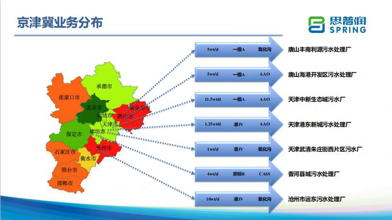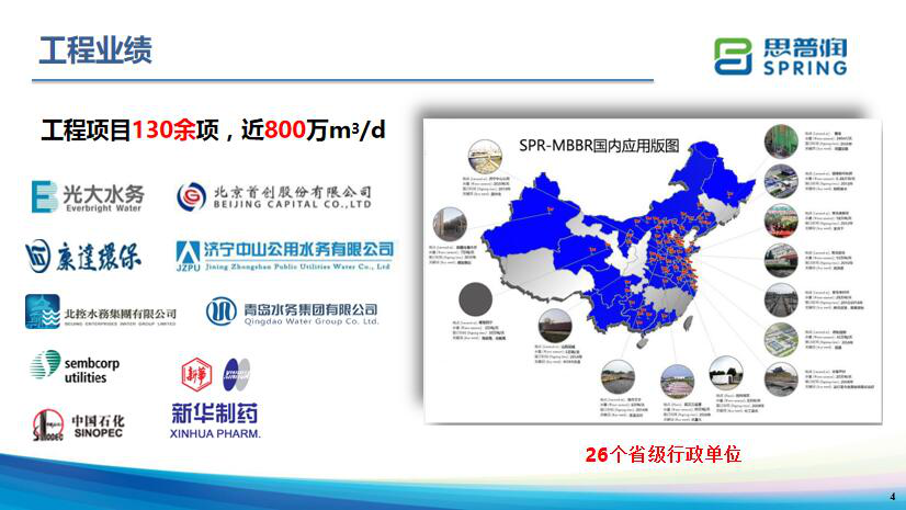 思普潤專注于MBBR工藝的研發(fā)與推廣,截至2019年5月,思普潤應用MBBR工藝累計實施了近800萬噸/日的工程業(yè)績,已在國內(nèi)26個省市實施污水處理廠新建、改造、村鎮(zhèn)污水點源治理、河道水環(huán)境恢復項目。思普潤已經(jīng)研發(fā)完成了出水可穩(wěn)定達到準IV類標準的MBBR工藝路線,目前在多個污水處理廠實現(xiàn)成功應用。