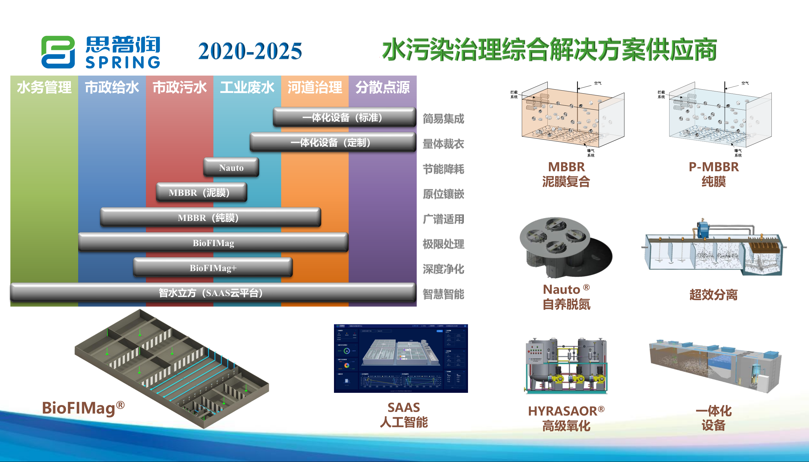 從MBBR工藝包到如今包含MBBR污水廠原位提標改造解決方案、BioFIMag®污水廠極限占地解決方案、微污染水/黑臭水體治理解決方案、Nauto®低碳低耗高氨氮廢水解決方案、Sprintage分散點源治理解決方案和高排放標準/難降解有機物解決方案的六大系列產品,思普潤圍繞MBBR核心工藝,打造了一系列面向不同應用場景的優(yōu)勢技術,邁向水污染治理綜合解決方案供應商,為實現能源平衡水處理概念廠持續(xù)創(chuàng)新。