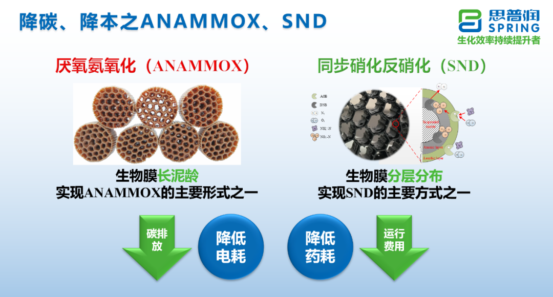思普潤(rùn)本次匯報(bào)以生化效率持續(xù)提升為核心目標(biāo),從本質(zhì)上區(qū)別活性污泥與生物膜,依托生物膜法的優(yōu)勢(shì),分享對(duì)污水生化處理技術(shù)發(fā)展的理解和經(jīng)驗(yàn)。于1893年誕生的生物膜法有著比活性污泥法更長(zhǎng)的發(fā)展歷史,但因早年間污水處理標(biāo)準(zhǔn)對(duì)脫氮要求較低、工業(yè)化水平不足導(dǎo)致應(yīng)用進(jìn)程相對(duì)較慢,近15年以來,隨著標(biāo)準(zhǔn)對(duì)脫氮要求的持續(xù)提高以及工業(yè)化水平的進(jìn)步,以 MBBR為代表的生物膜法得到了飛速發(fā)展。基于生物膜法專性培養(yǎng)及定向富集的特點(diǎn),硝化菌群豐度可達(dá)到活性污泥法的10倍以上。同時(shí),基于生物膜分層分布的特性,在生物膜上形成好氧/缺氧微環(huán)境,為同步硝化反硝化脫氮奠定基礎(chǔ),同時(shí)基于智水優(yōu)控智能管理系統(tǒng)的生物膜法精細(xì)化控制,為厭氧氨氧化菌的高效富集提供基礎(chǔ),大幅提高了生化系統(tǒng)的處理效能。