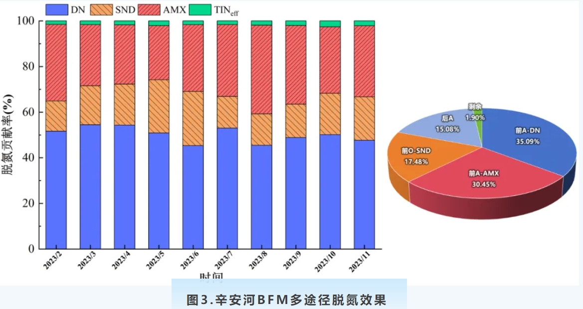 煙臺辛安河BFM項目基于生物膜高負荷性能實現(xiàn)了高效的脫氮除磷效果,出水氨氮≤0.5mg/L,TN<5mg/L(均值≤2mg/L)、TP≤0.1mg/L,冬季低溫條件下出水依然穩(wěn)定優(yōu)于設(shè)計排放標(biāo)準。項目構(gòu)建了“異養(yǎng)反硝化-自養(yǎng)厭氧氨氧化-同步硝化反硝化”的多途徑脫氮體系,實現(xiàn)了敏感型厭氧氨氧化菌的高效富集,相對豐度接近6%,厭氧氨氧化脫氮貢獻率長期且穩(wěn)定超過25%;好氧區(qū)基于生物膜分層分布特點實現(xiàn)反硝化菌富集,同步硝化反硝化脫氮貢獻率達15%以上,降低了傳統(tǒng)單一脫氮路徑對于碳源的需求,噸水直接運行費用降低0.2元/m3以上。智水優(yōu)控系統(tǒng)的加載保障了短流程下運行調(diào)控的快速響應(yīng)和厭氧氨氧化菌的精準控制,破除了主流自養(yǎng)脫氮工藝應(yīng)用壁壘,在高標(biāo)準基礎(chǔ)上實現(xiàn)節(jié)能降碳。