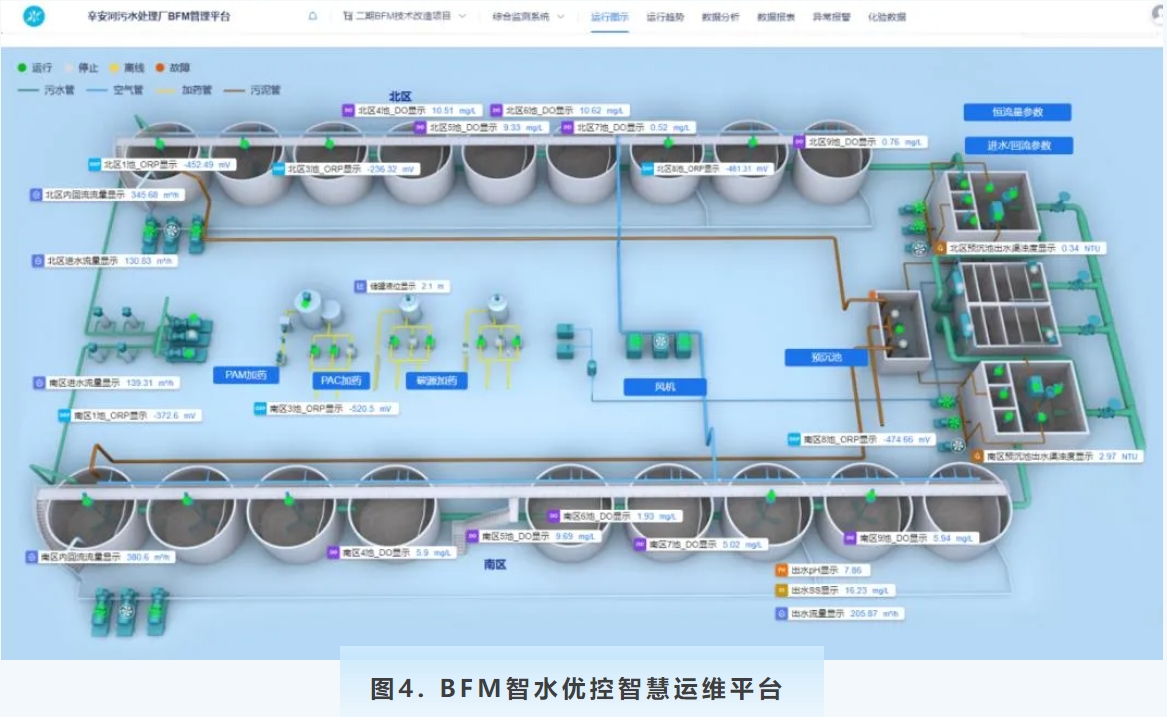 開發(fā)了基于“數(shù)據(jù)清洗-AI智能控制-全要素智慧管理”的智水優(yōu)控云平臺,構(gòu)建了儀表異常值檢測及軟測量模型,解決了污水廠儀表設(shè)備投資受限、準確度低等難題;研發(fā)了“前后饋+AI智能算法引擎”的加藥-曝氣-回流全系統(tǒng)控制方法,實現(xiàn)了對于敏感型厭氧氨氧化菌的精準控制和短流程下調(diào)控的快速響應(yīng);開發(fā)了集水線智能控制、水廠虛擬巡檢、設(shè)備全生命周期維護、多渠道預(yù)警報警于一體的智慧運管平臺,解放了運營人員人力投入。