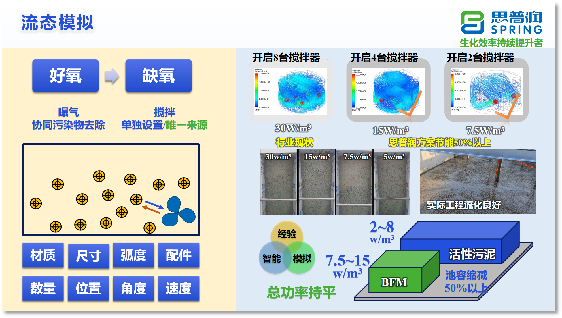 基于生物膜工藝流態(tài)模擬平臺,思普潤在確保載體均勻流化的情況下,將缺氧區(qū)流化能耗從行業(yè)30W/m3降至7.5W/m3,降幅達到75%,同步提升設備壽命,支撐BFM工藝全球領先優(yōu)勢。